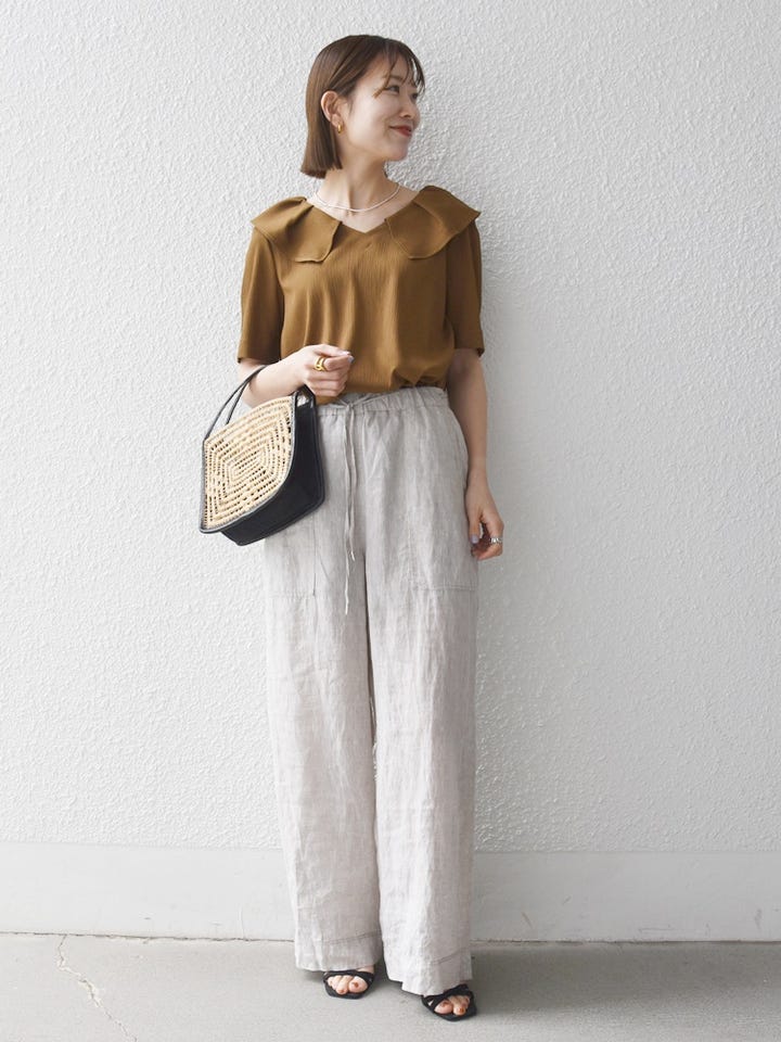 きれいめブラウスにリネンパンツを合わせた大人のリラクシーなスタイルに◎