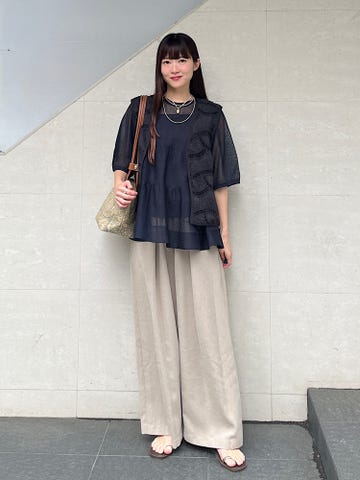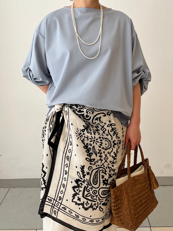 着心地:身幅があるゆったりシルエットなので楽です。しっかり光沢があり、ひねりのデザインやトレンドのシアー素材とのMIXで1枚でも華やかさときちんと感が出ます。