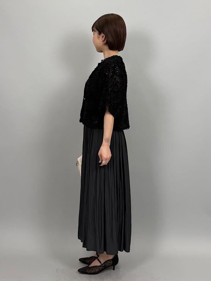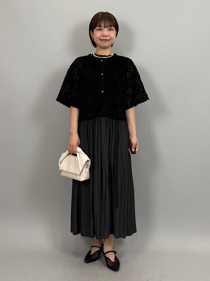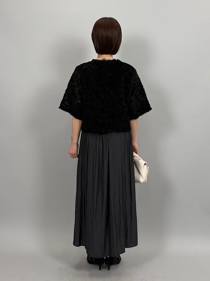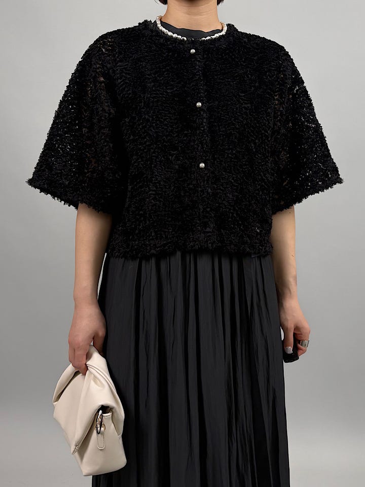 立体的なチュール素材。やわらかいチュールなので、チクチクせず着ていただけます◎チュール素材とパールボタンが華やかなので、シンプルなアイテムを合わせるだけでコーデが完成します。