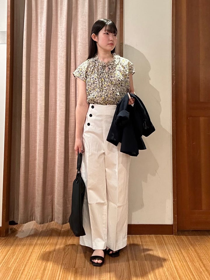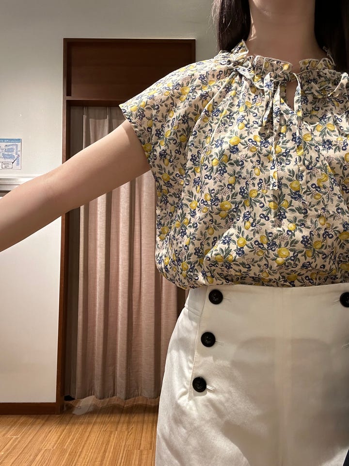 夏らしいレモン柄のブラウスです。首元はフリルがあり、ネックレスなくても華やかに着用できます。