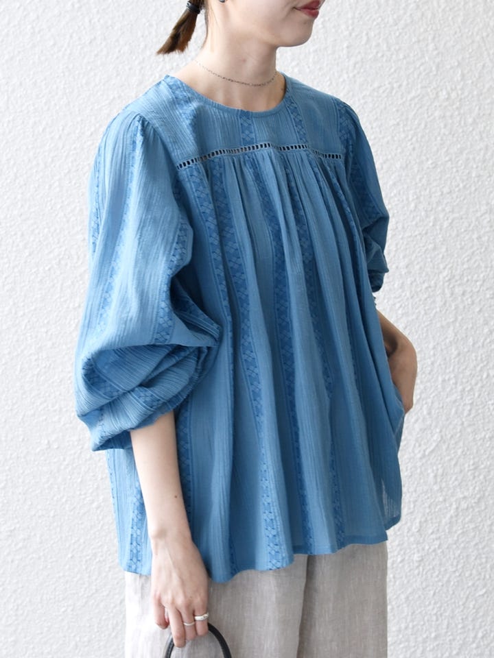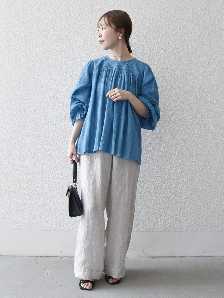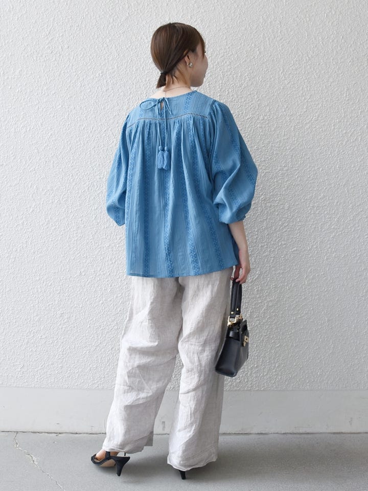 着用アイテム:SHIPS any:〈洗濯機可能〉コットン ミックス ハシゴ レース ギャザー ブラウス ブルー