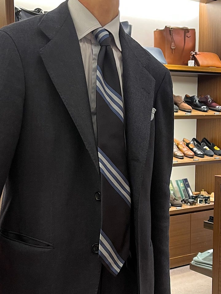 右下がりでレジメンタルストライプを表現した別注【TUDOR ROSES】のネクタイ。