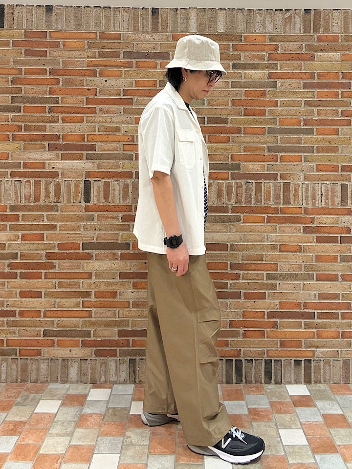 シャツのような生地感に加えて、太めのシルエット。