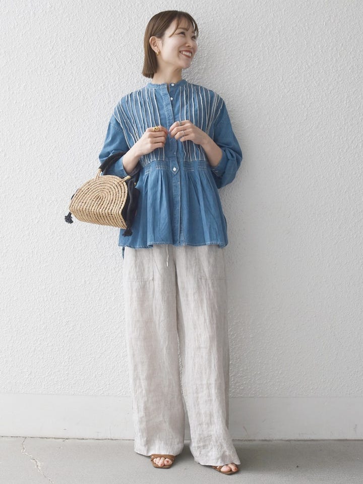 着用アイテム:〈洗濯機可能〉デニム シーム バンドカラー シャツ ブラウス ライトブルー