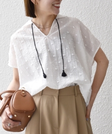 着用アイテム:〈洗濯機可能〉ドット ジャカード タッセル スキッパー ブラウス ホワイト