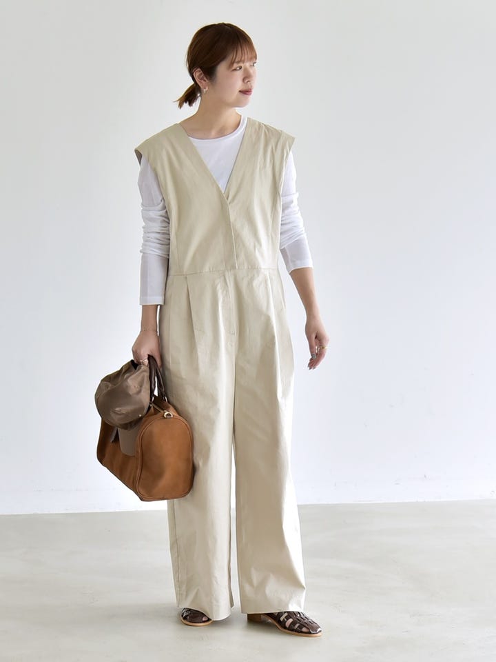 淡いベージュのオールインワンに白のロンTを重ねた、ナチュラルで柔らかなレイヤードスタイル。