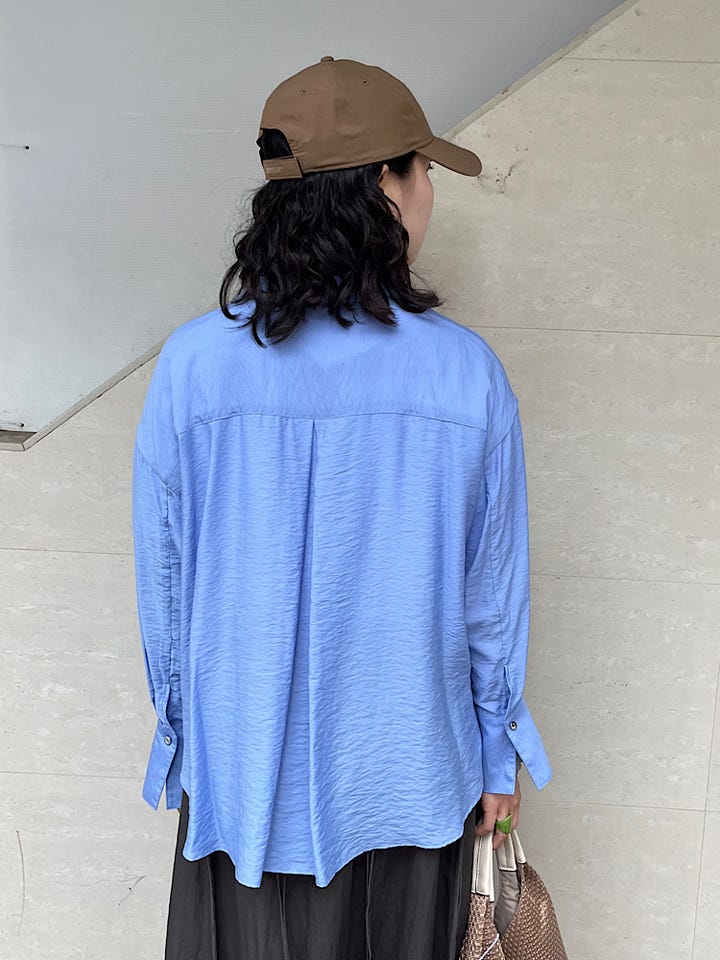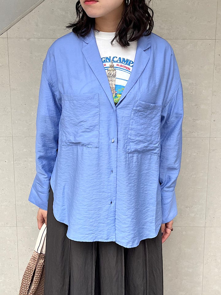 シャツジャケットのような、テーラードの襟なので羽織としても着ていただきやすいです。薄手の少しテロンとした生地で、風通しもよく着心地も◎ 夏の冷房対策にもおすすめです。