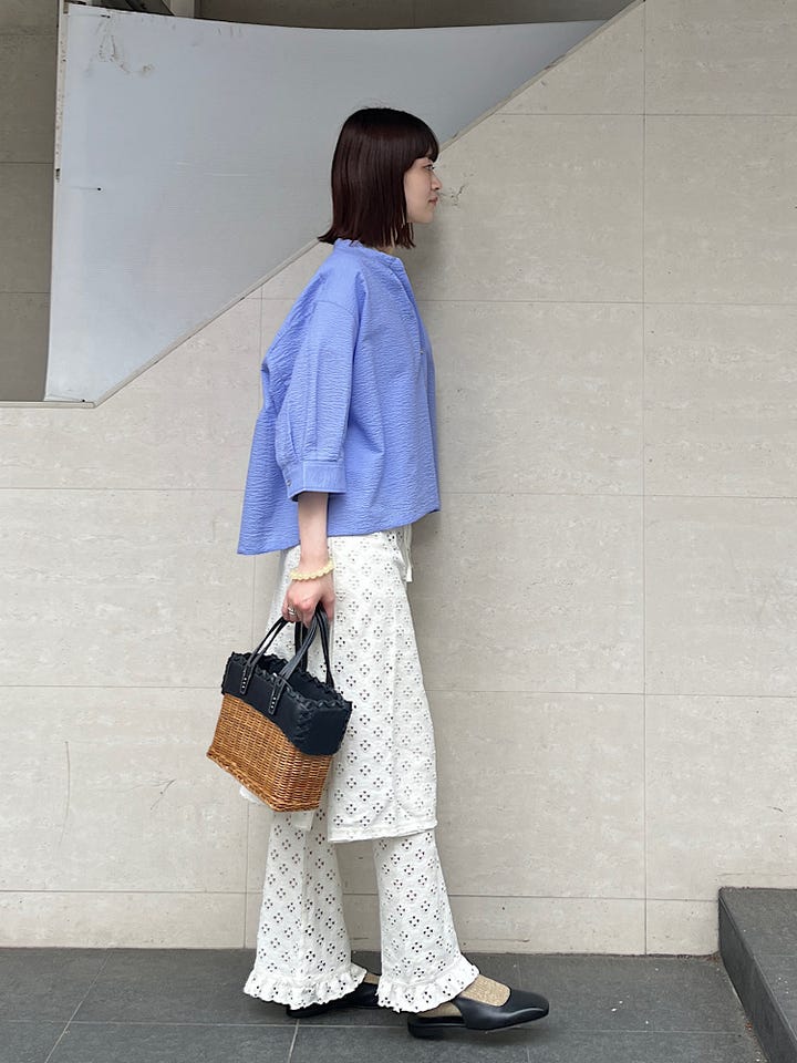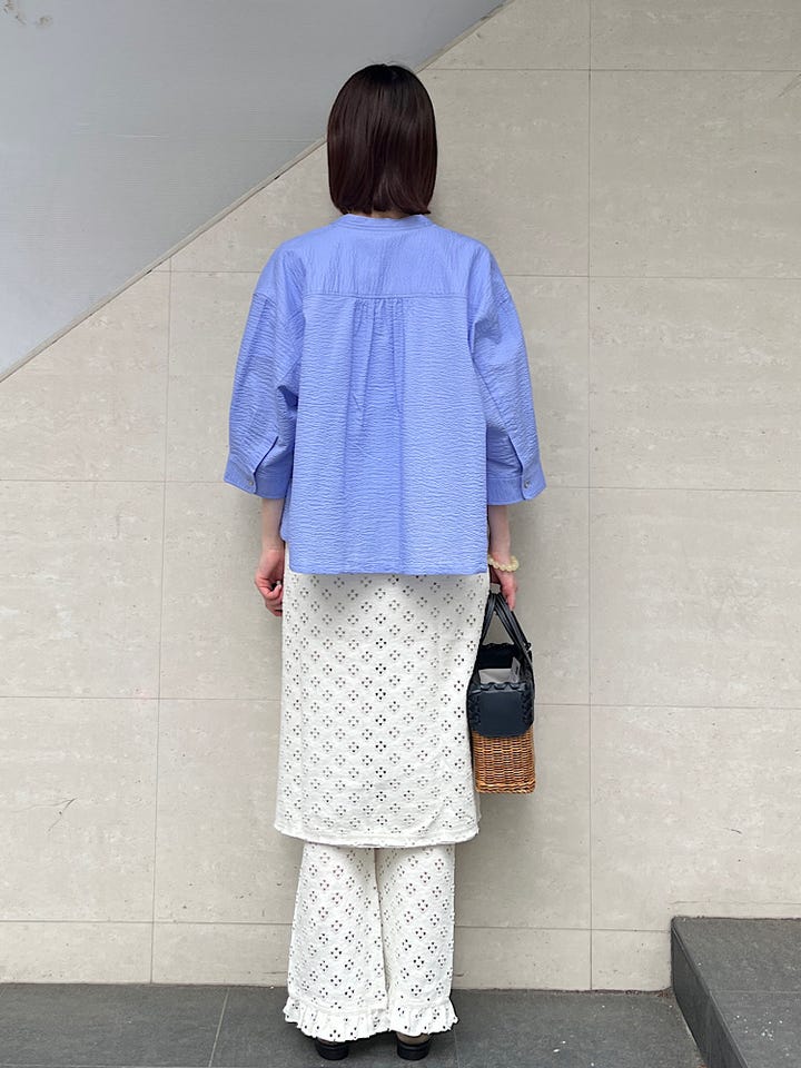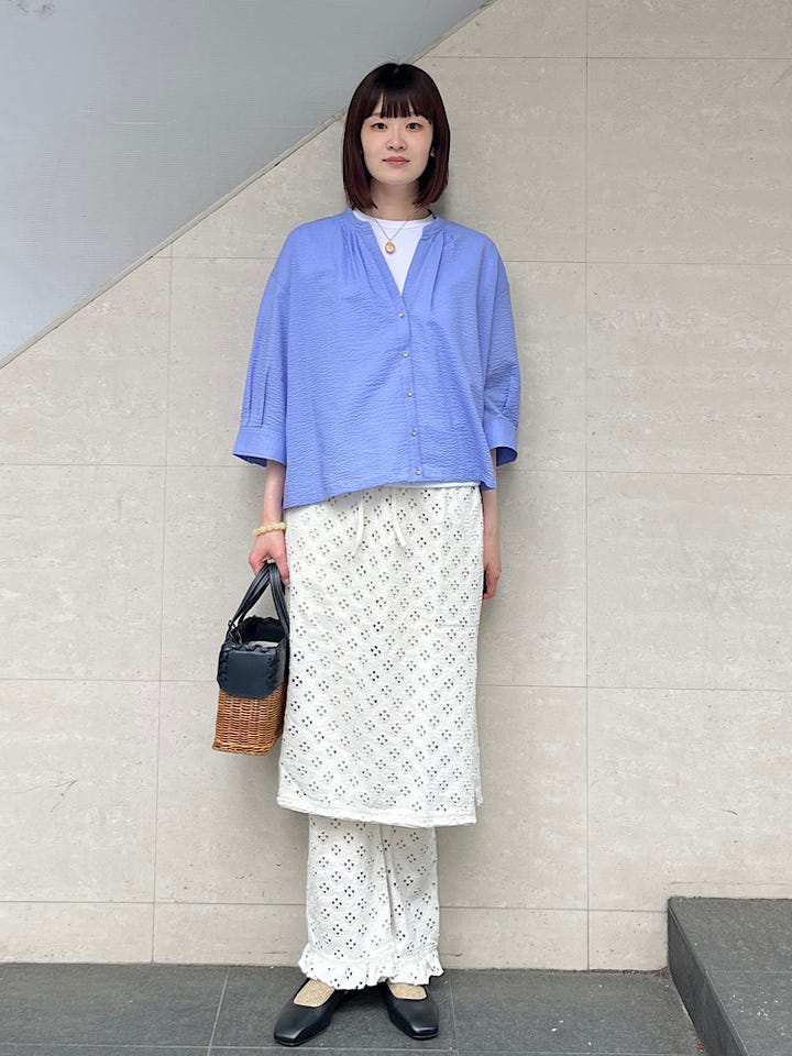 着心地:レイヤード用のアイテムです。同素材のパンツと合わせてみましたが、デニムやカラーパンツとの相性もよく様々なコーデに活躍してくれるアイテムです。