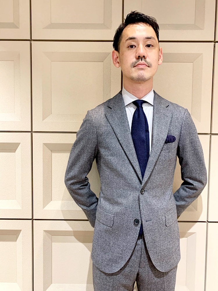 LORO PIANA社の生地を使用したスーツです。 ネイビータイでベーシックなスタイリングにまとめました。 着用レビュー 】 着用アイテム:ジャケット 身長:182cm / 普段サイズ:46/ 着用サイズ:46 サイズ感:ジャケットは程よく細く、ウエストのシェイプが綺麗なラインです。 素材感:やや起毛感のあるソフトな生地感です。 着心地:肉厚はしっかり有りますが、非常に軽く着て頂けます。 着用アイテム:パンツ 身長:182cm / 普段サイズ:46/ 着用サイズ:46 サイズ感:ラインも非常に綺麗なスリムなシルエットです。 素材感: やや起毛感のあるソフトな生地感です。 着心地:ソフトで柔らかい生地なのではき心地抜群です。