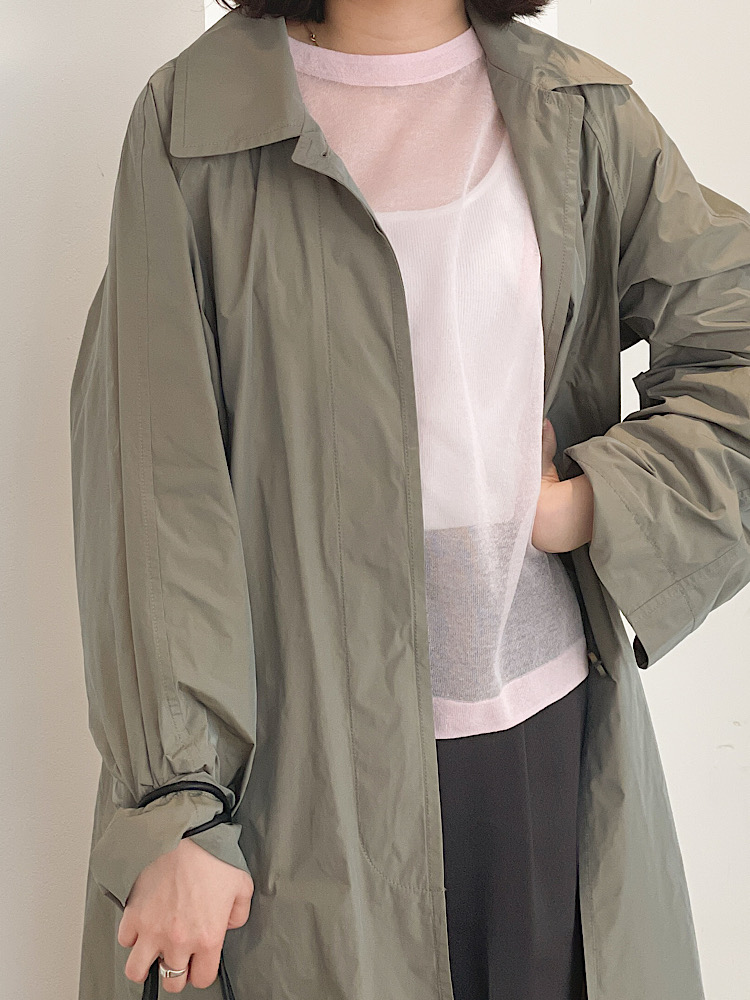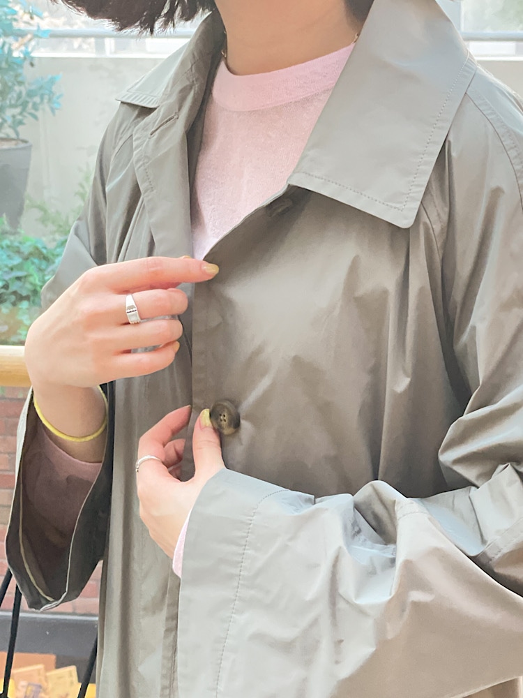 素材感・着心地:アウターには珍しいシャンブレー素材。裏地なしで薄地。袖が広いのでゆったりルーズにきていただけます。