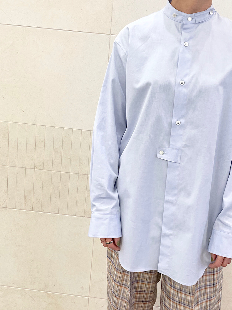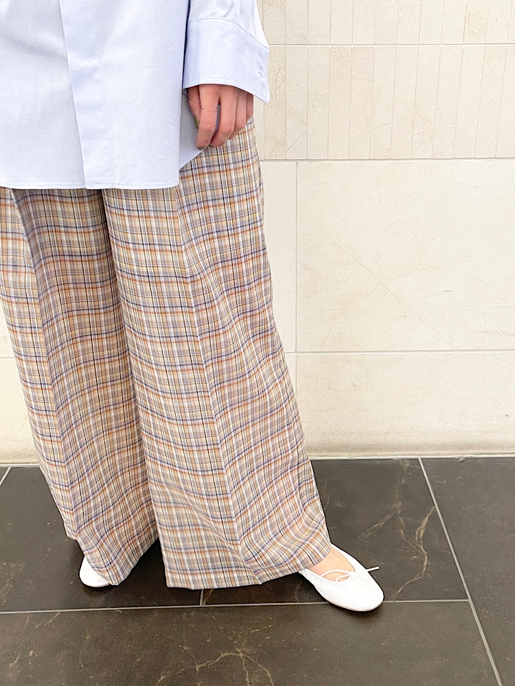 大きめのシャツにシアーチェックのパンツを合わせ、シンプルながら素材感で遊んだ春らしいスタイリングです。