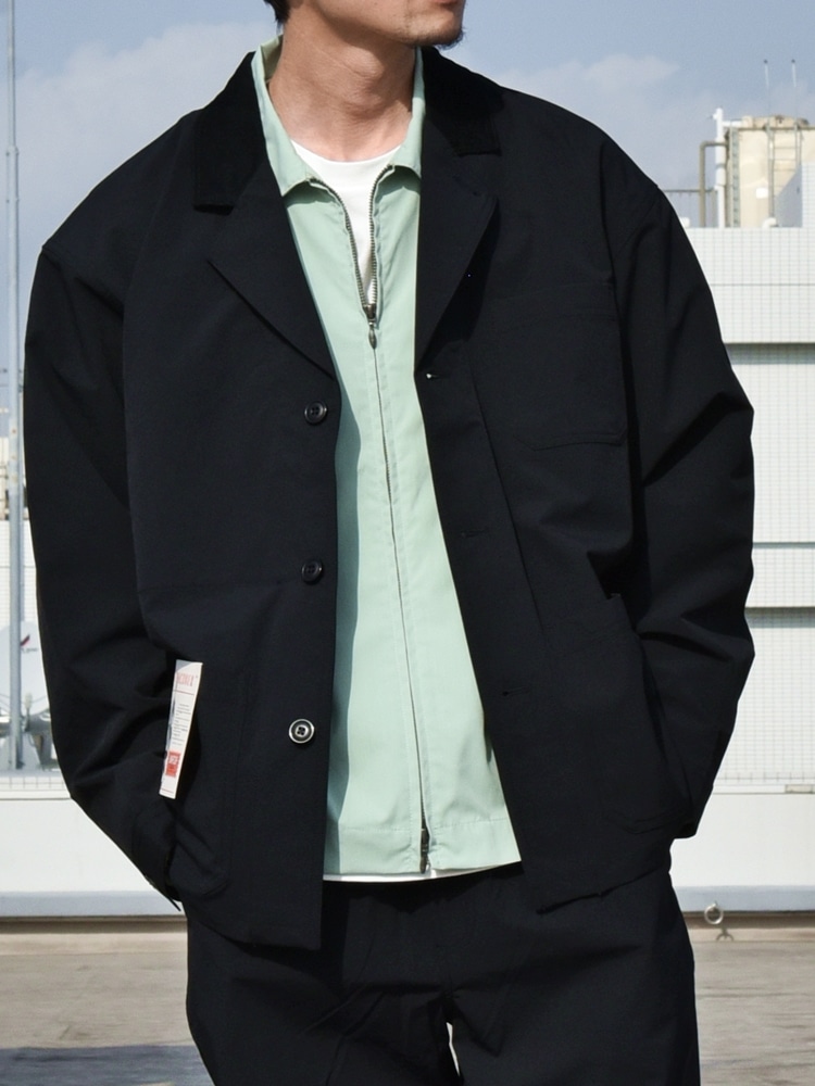 軽量のブルゾンにジャケットを合わせたワークとスポーティーのミックススタイル。