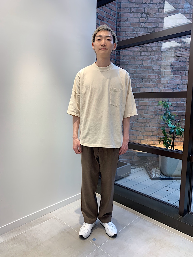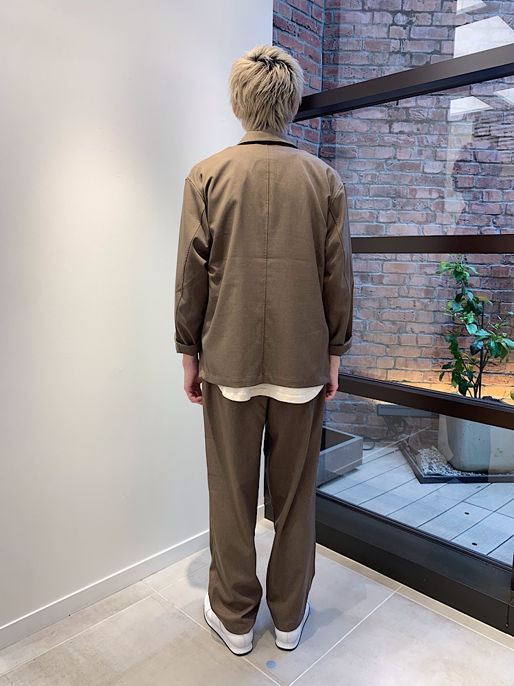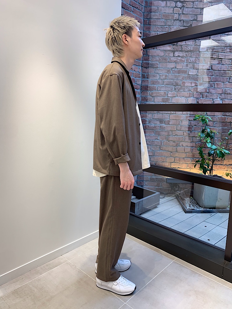 綺麗目なベージュのセットアップをジャスト目にスタイリングし、決まり過ぎないようにラフさと清潔感を出すように白スニーカーで合わせました。