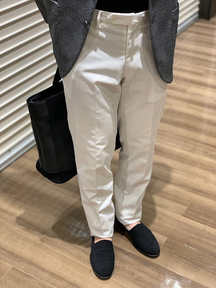 モノトーンでまとめつつ涼しく見えるよう心がけました。シューズとバックの素材感がリンクしているのもポイントです。
