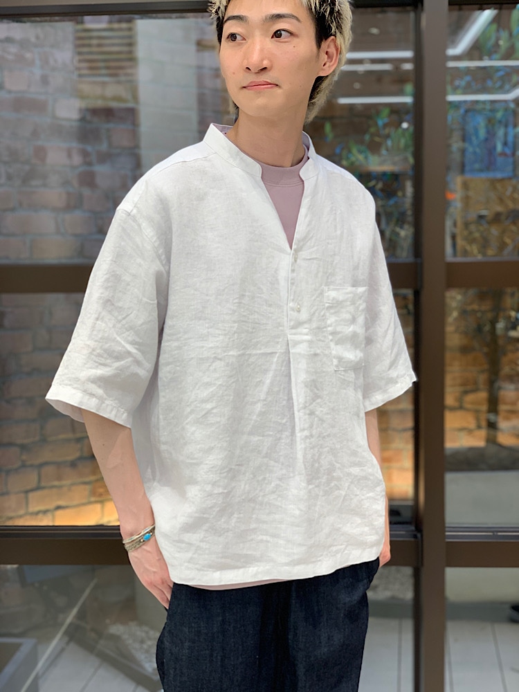 デニムに白の麻のシャツでシンプル春夏コーディネートになります。インナーにラベンダーカラーを差し色で合わせました。