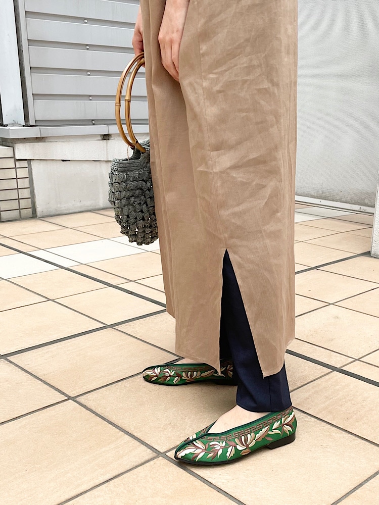 ロングのリネンワンピにテロッとしたワイドパンツを重ねて、夏のレイヤードスタイルに。シンプルなコーデなので個性的な小物合わせが◎