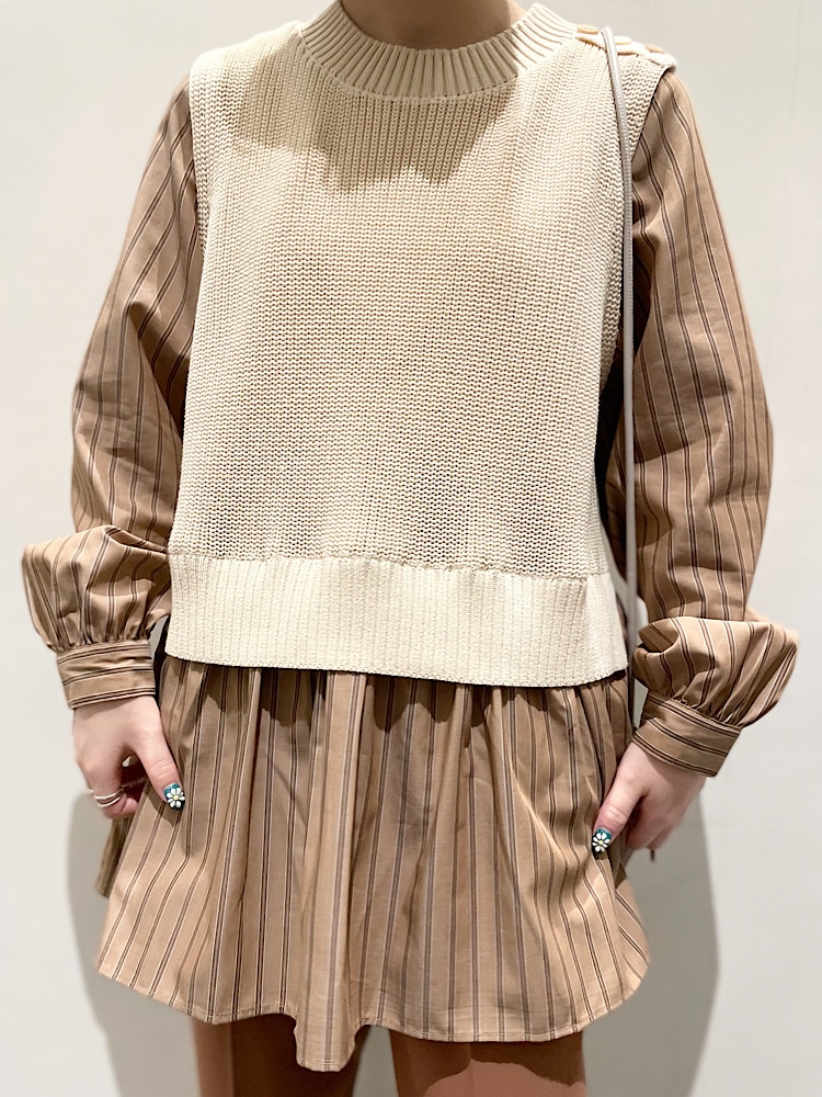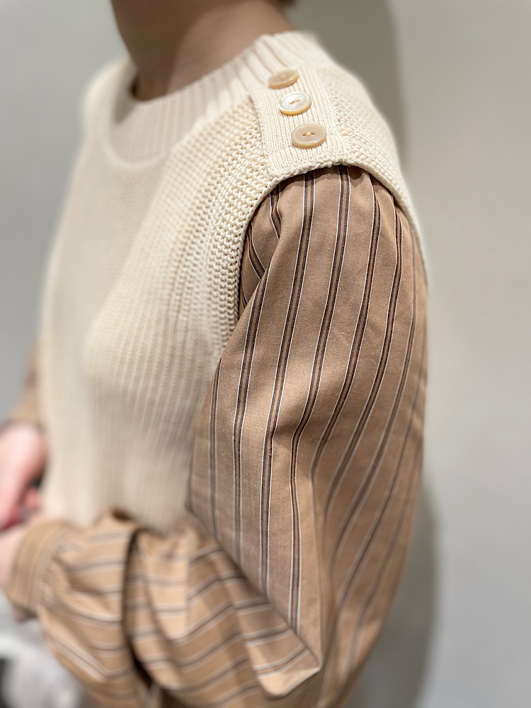商品紹介:ニットとシャツのドッキングしていてトップスで元々レイヤードしているようなデザインの為1枚で決まります。シャツのギャザー部分が広がりすぎない為収まりがよく甘すぎずカジュアルなパンツとも相性がいいです。