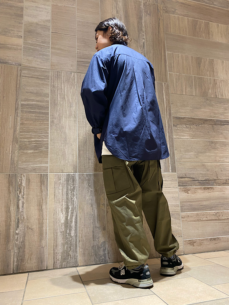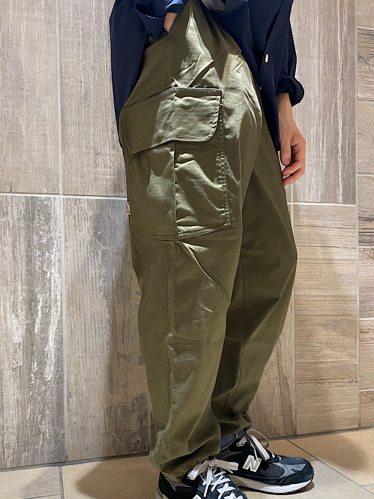 【素材感・着心地】素材はコットンとポリエステルです。裾にドローコードがあるので、シルエットに変化をくわえることもできます。また、テーパードがかかっており一般的なミリタリーパンツと違った表情があります。