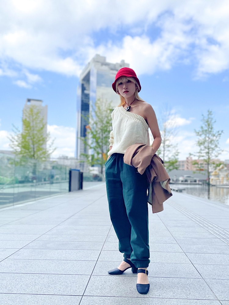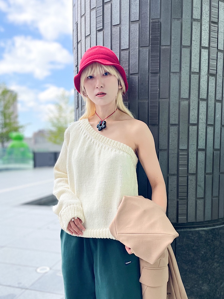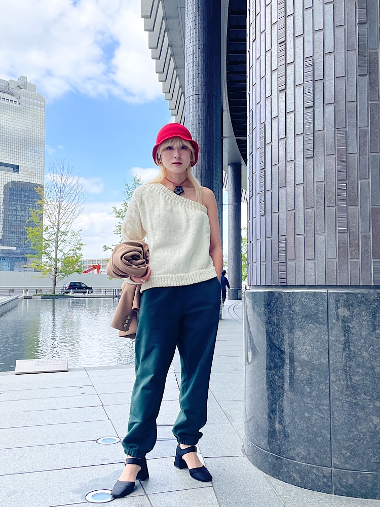 着こなしポイント: アシメトリーのトップスは、インナー選びも楽しくなります