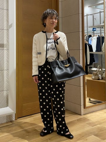 【素材感・着心地】アウターは73%ウール&27%ナイロン。袖口の折り返しとパイピングや襟のデザインがクラシックな雰囲気を。キュロットはベージュ&ブラウンの暖色系チェック。程良い重みにより広がりを抑えた落ち感が素晴らしい。暖かみある同系色カラーでのスタイリング。