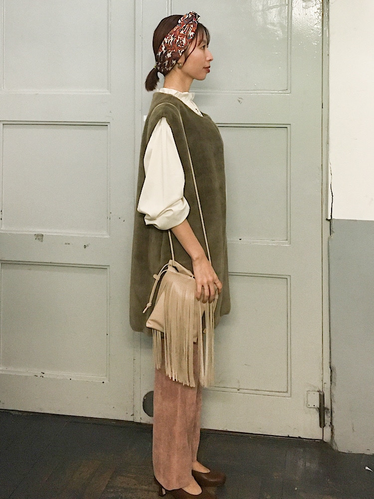 サイズ感:ウエストはトップスインしやすい余裕あり。着丈は長すぎないのでフラットシューズでも合わせて頂けます。