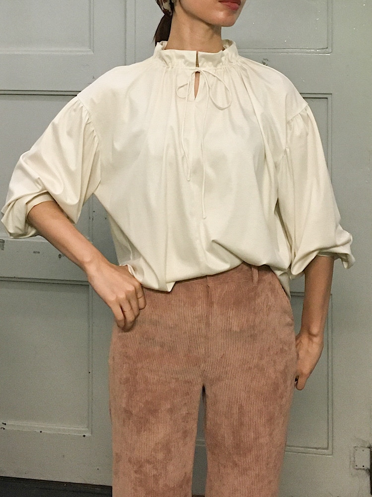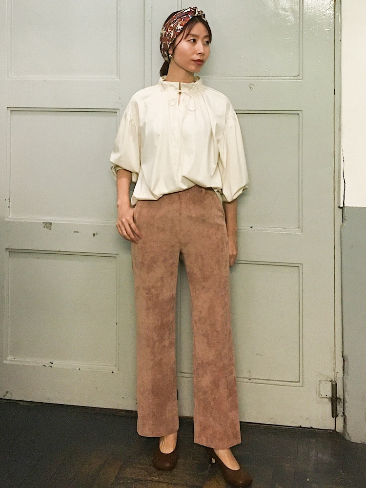 サイズ感:ゆったりしたサイズ感ですが、余分な余りも無く綺麗に決まります。薄手のトップスからニットまで合わせて頂けます。