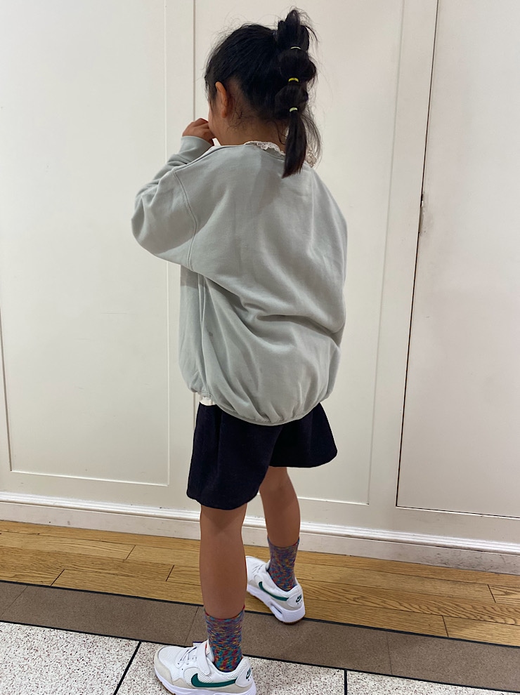 プクっとしたシルエットがかわいいスウェットです❤️後ろ姿もかわいい😍 ブラウスの襟を出して着ると、女の子らしさが増しますね✨✨✨