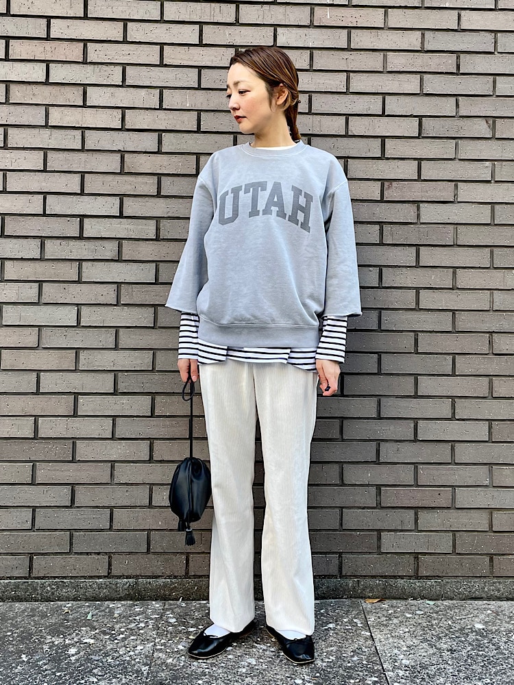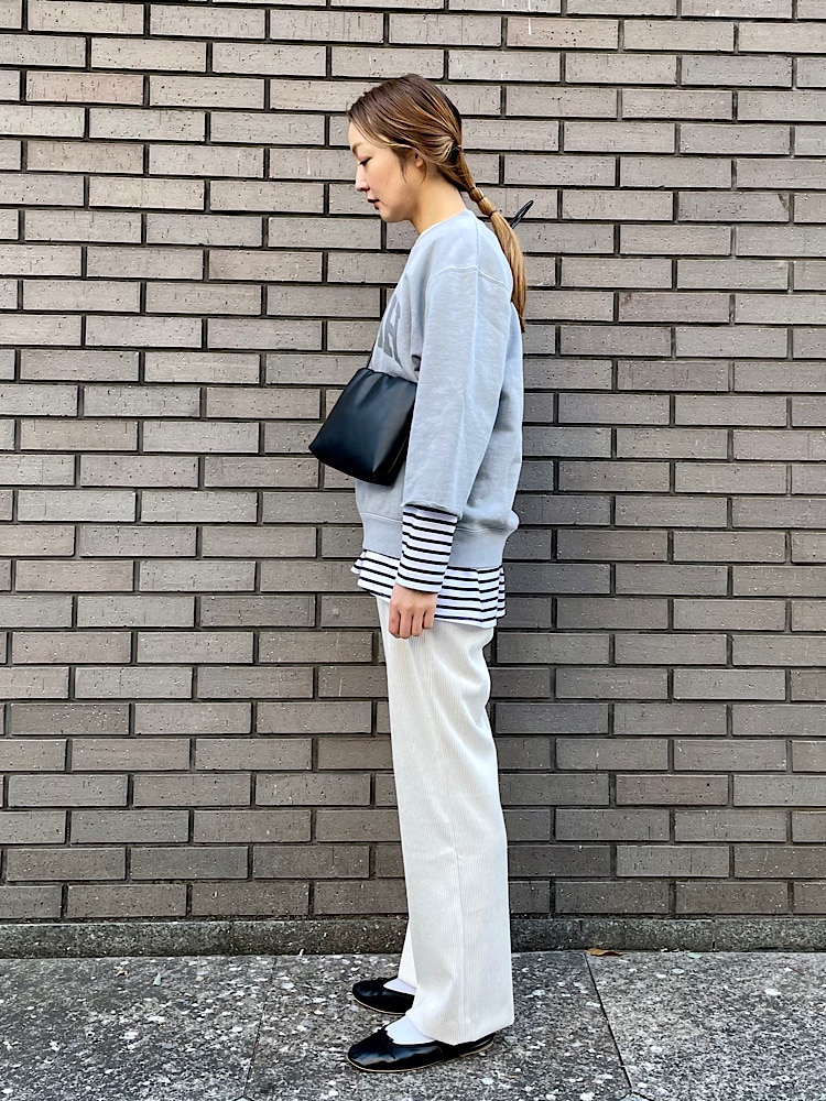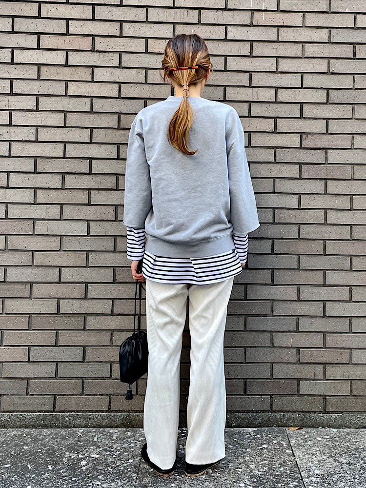 素材感・着心地:コットンの柔らかい素材感。裾がリブになっておりボトムを選ばす着用できます