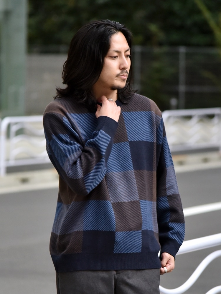 品の良い素材感のチェック柄ニットを使用したカジュアルコーデ