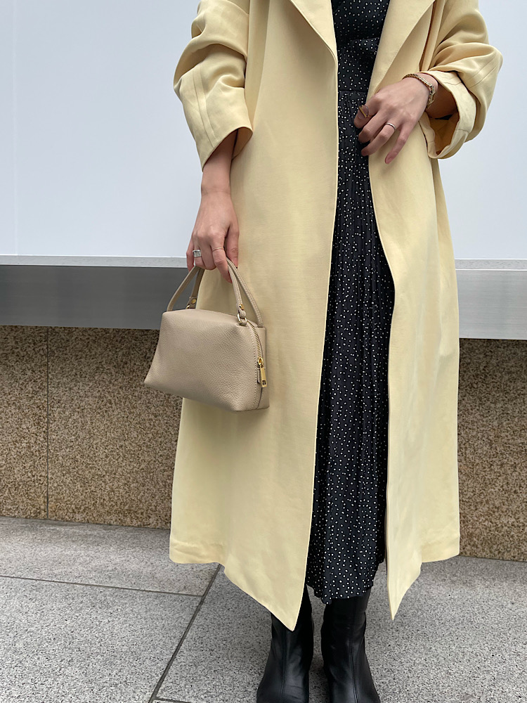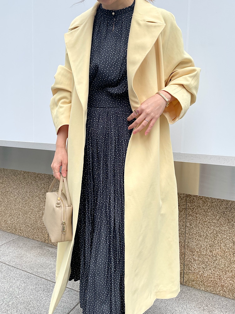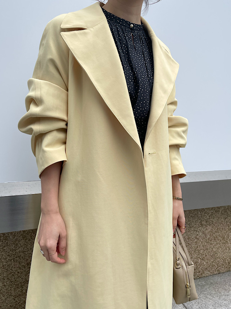 【素材感・着心地】程よくハリ感もあり、綺麗なライン。ウエストを絞って着ても綺麗です。軽くて、アームもゆったりしているので、袖デザイントップスでもラクに羽織れます。春色カラーでインナーがシックな色味でも華やかな印象になります。