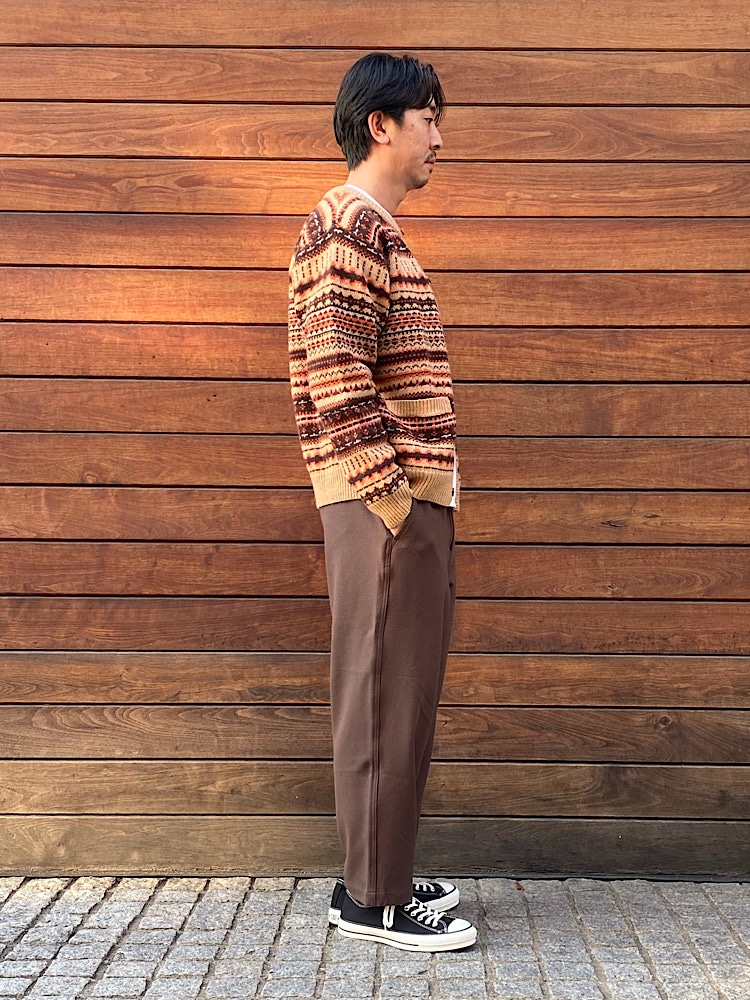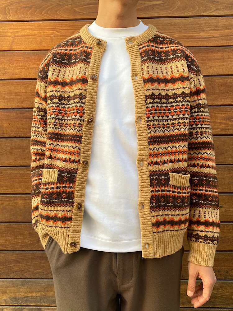 素材感/着心地:ノルディック柄が目立つカーディガンです。丸いシルエットと首下まであるボタンが特徴です。