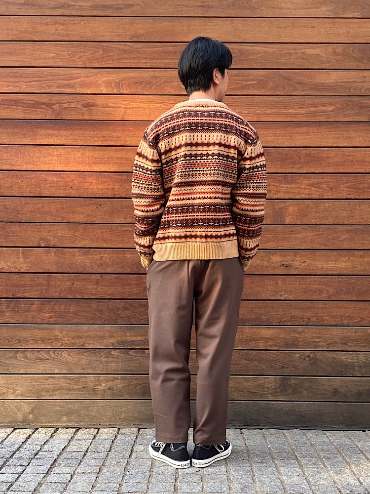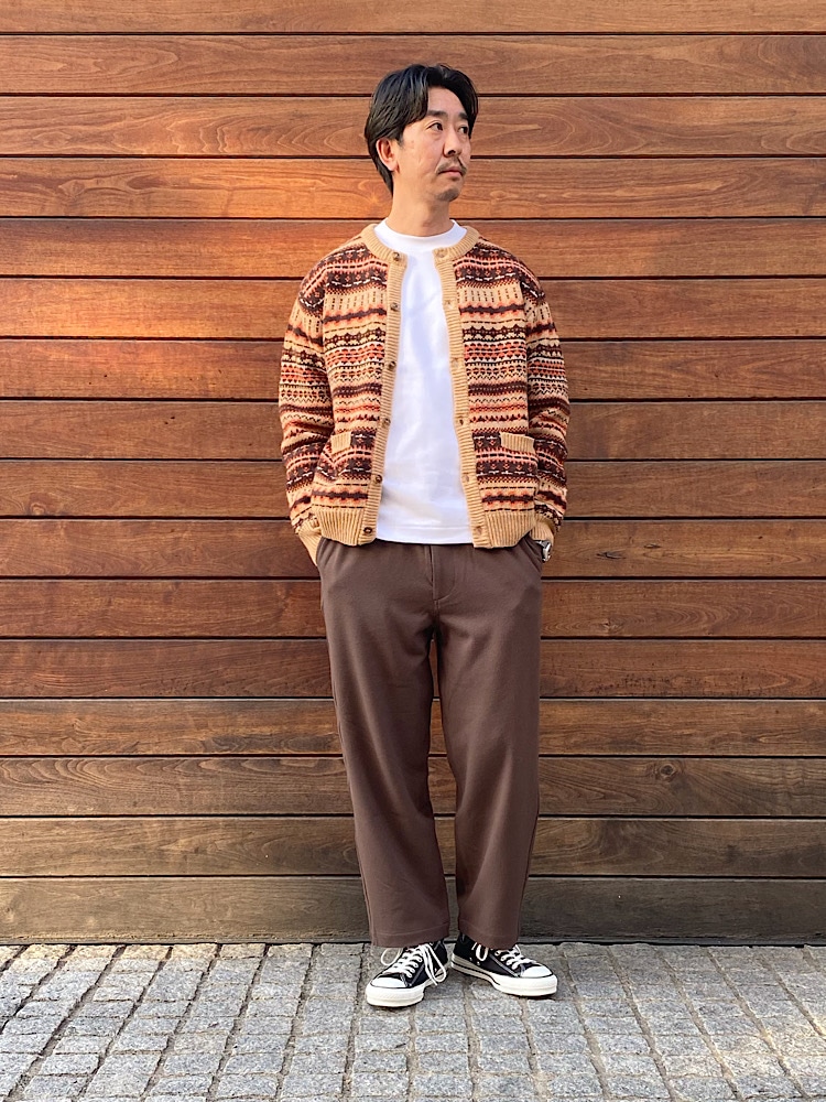 ノルディック柄のカーディガンで同色コーディネートです。全体の色を合わせても統一感を出しています。靴を黒にしたので締まった印象になります。
