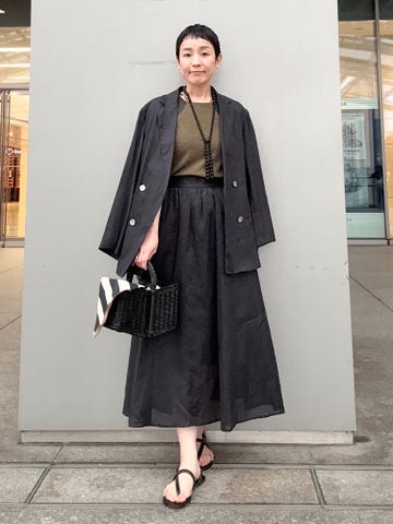 カジュアルな装いにはスリットスカートの大人っぽさを。