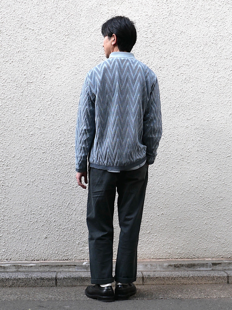 大きいジャガード柄が特徴的な春物カーディガンのご紹介です。柄を強調する為、シンプルなアイテムでまとめました。