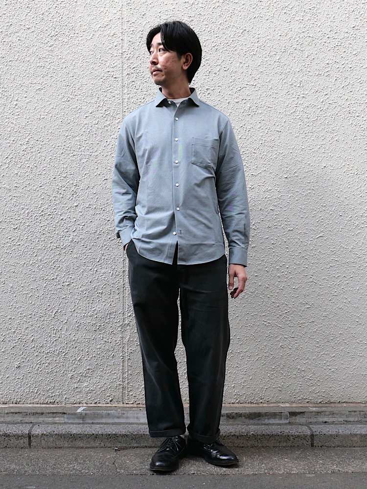 素材感/着心地:ジャージ素材で伸縮性があります。定番のセミワイドカラーでコーディネートの幅も広いです。
