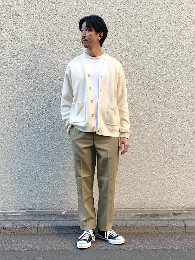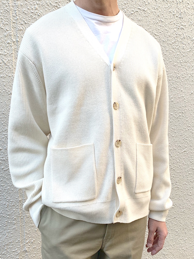 リラックスシルエットのカーディガンのご紹介です。クリーンなイメージがあったのでワントーンでシンプルにコーディネートしました。