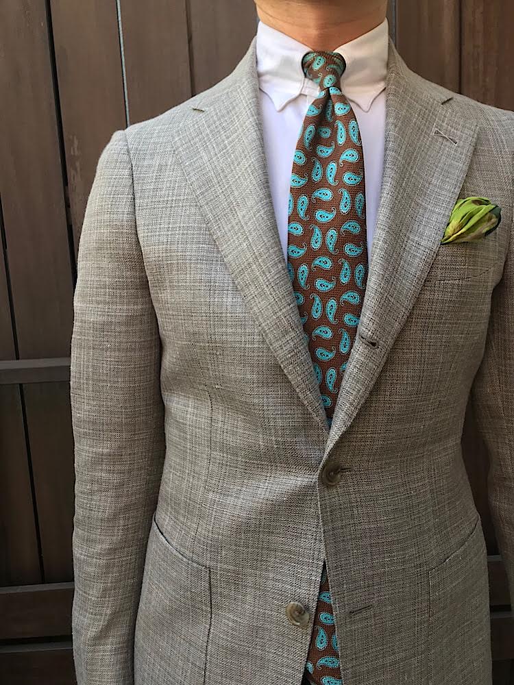 春夏定番の3者混。シルクの柔らかさと、リネンのシャリ感、ウールのドレープ感が高級感を演出しております。着心地:ジャケット自体が非常に軽いので、体にフィットし着心地抜群です。