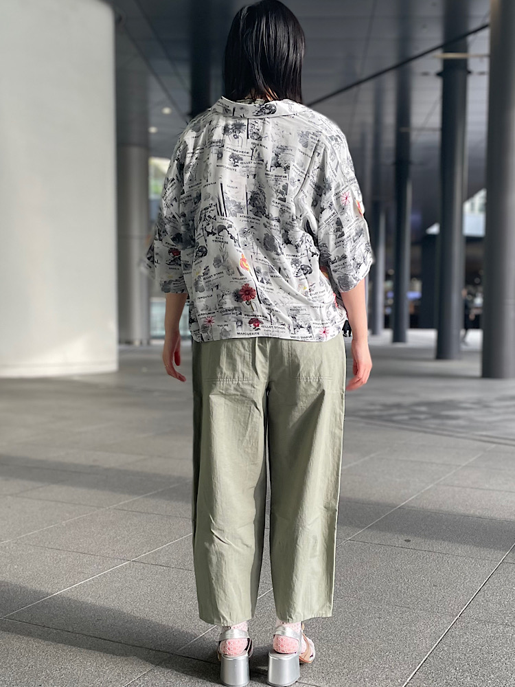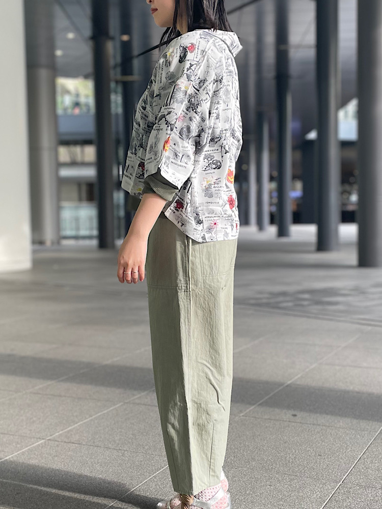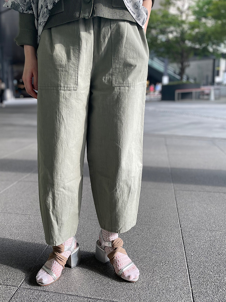 着心地:ウエストがドロストで調節できるようになっているので、トップスに合わせて印象を変えて頂けます。全体的にゆったりとしたシルエットでリラックス感がありカジュアルな装いに。ハリのある素材感でバルーンパンツのようなひろがる形で、タイトめなリブニットやシャツをインしたスタイリングがおすすめです。