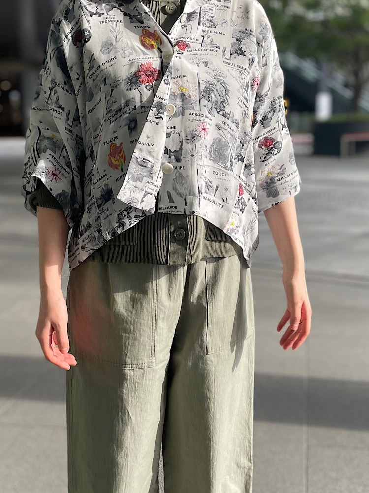 ナチュラルな色合いを使ってワントーンコーデに。無地でのぺっとなりすぎないように柄シャツを上から重ねてみました。