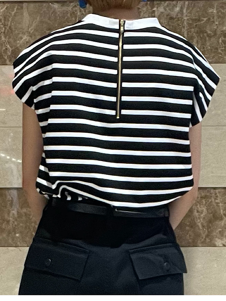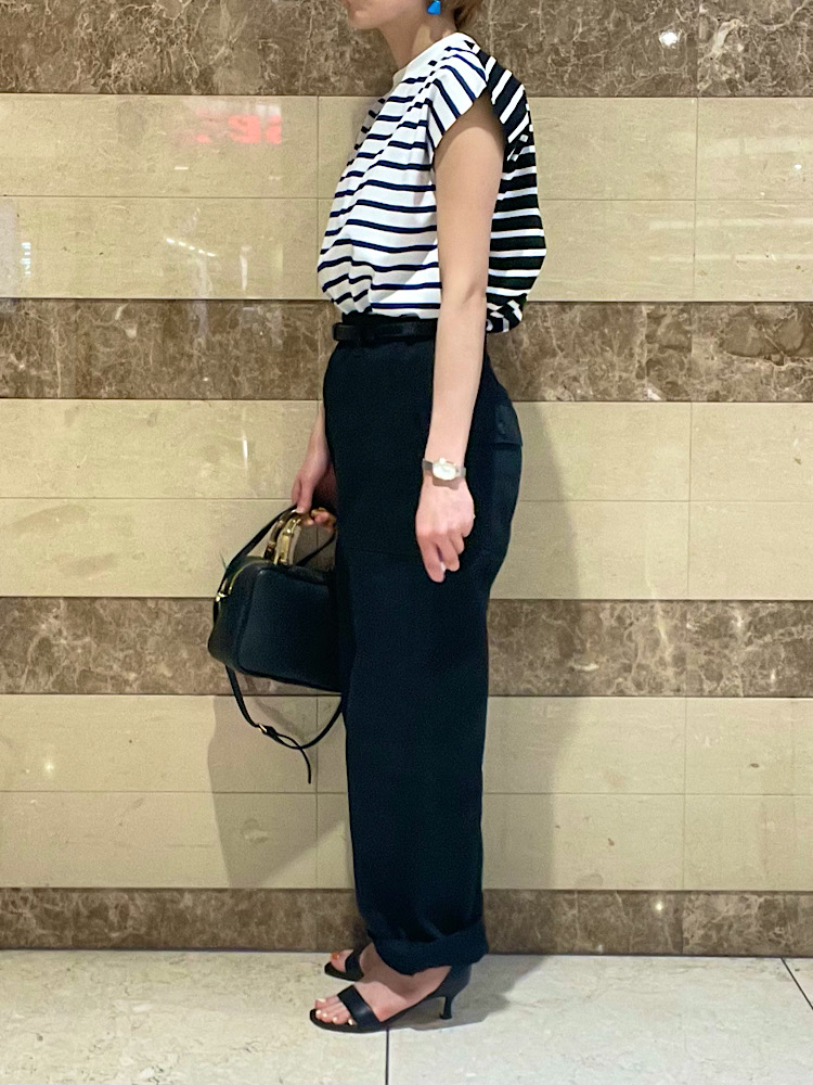 マリンボーダーをモノトーンでまとめた辛口スタイル。