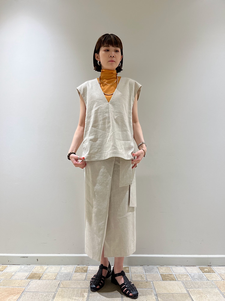 素材感:麻混のラスティックな素材です。着用しているラップスカートと同素材です。