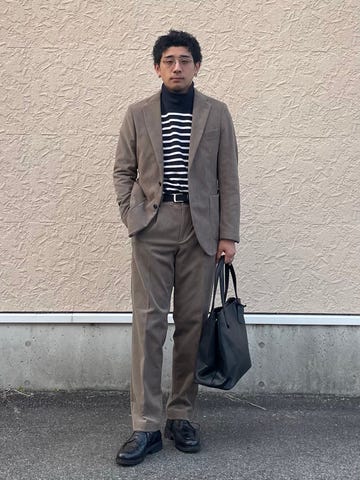 【素材感・着心地】しっかりした生地感。やや細身ですっきりとしたシルエット。前に4つボタンが付いている。