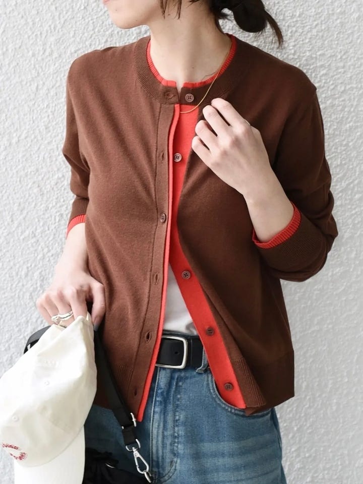 着用アイテム:配色 ニット クルーネック カーディガン