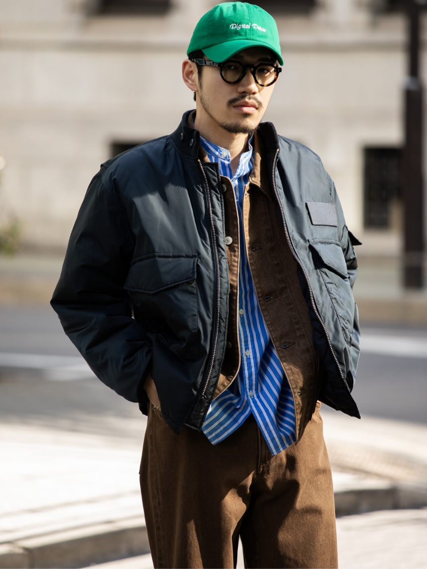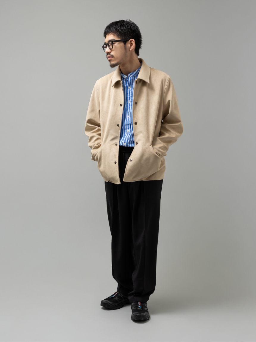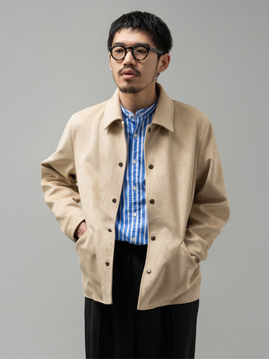 コートを着るか迷う時期。バンドカラーの抜けとタイプライター生地の硬質さが、スエードのコーチブルゾンを軸にした装いに一段軽い空気をもたらす。防寒と軽快さのバランスが難しい季節でも、スタイリングの重心を自然に引き上げてくれる。