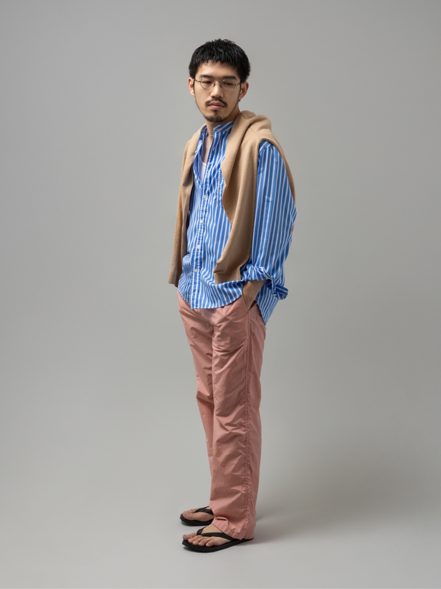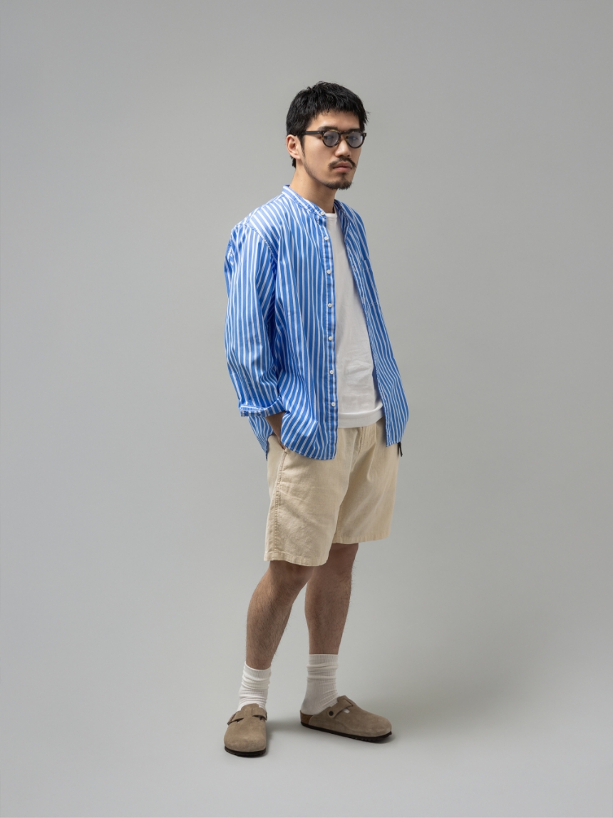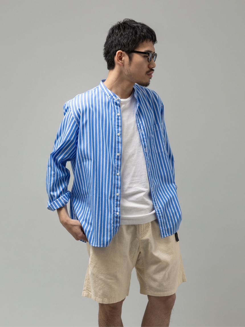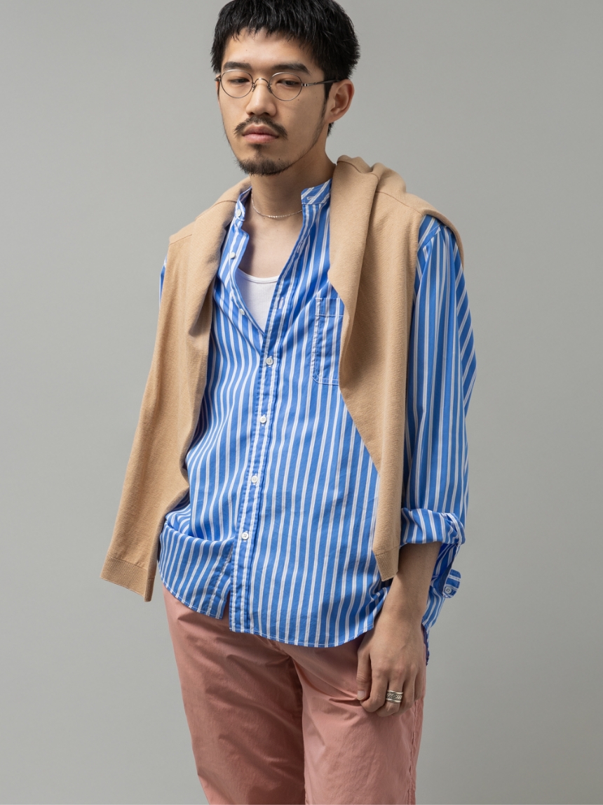 シャツの顔とも言われる襟には、あえてバンドカラーを採用した。レギュラーカラーのような堅さがなく、首元はすっきりとした印象。程よいカジュアルさと抜け感が生まれ、リラックスしながらも洒落た表情に仕上がる。