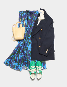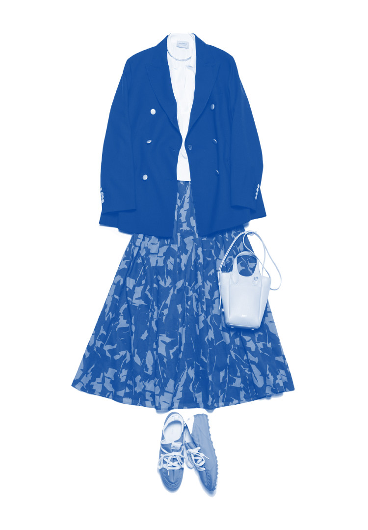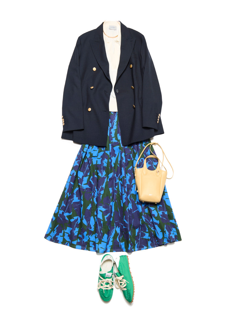 端正な紺色のブレザーに、同系のブルーを重ねた柄スカートで軽やかさを添えて。クラシックな中に華やかな女性らしさを加えました。足元はグリーンのスニーカーで外し、華やぎのある正統派の装いに、さわやかな抜け感をきかせています。ニットポロはメンズライクな印象がありますが、スキッパータイプなら無骨になりすぎず、やわらかな表情に仕上がります。