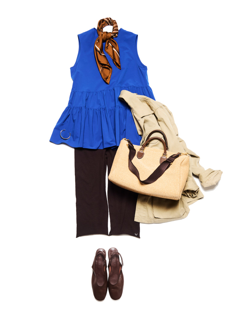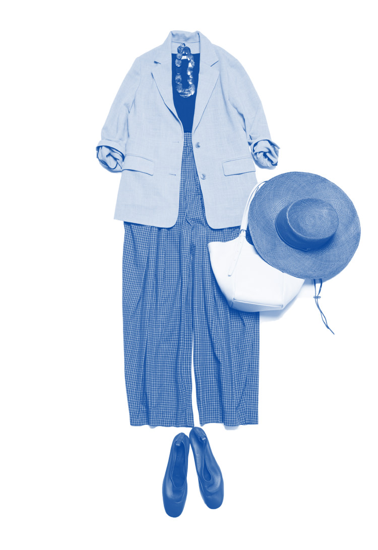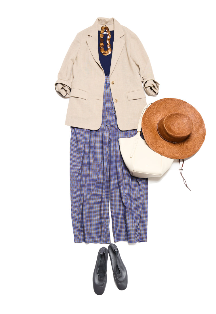 シンプルなキャミソールに、ゆるやかなシルエットのブルーチェックパンツを合わせたリラックススタイル。ネイビーの清潔感と品の良さで、ラフになりすぎず整います。ジャケットやレザーのバッグ、シューズで全体をほどよく引き締め、大人の女性の洗練されたバランスに。リゾート感のある装いにも、ピリッと引き締める要素を必ず添えるのがマイルールです。