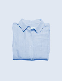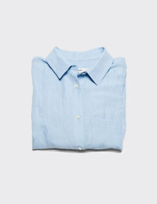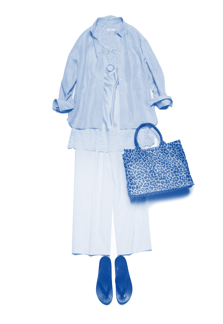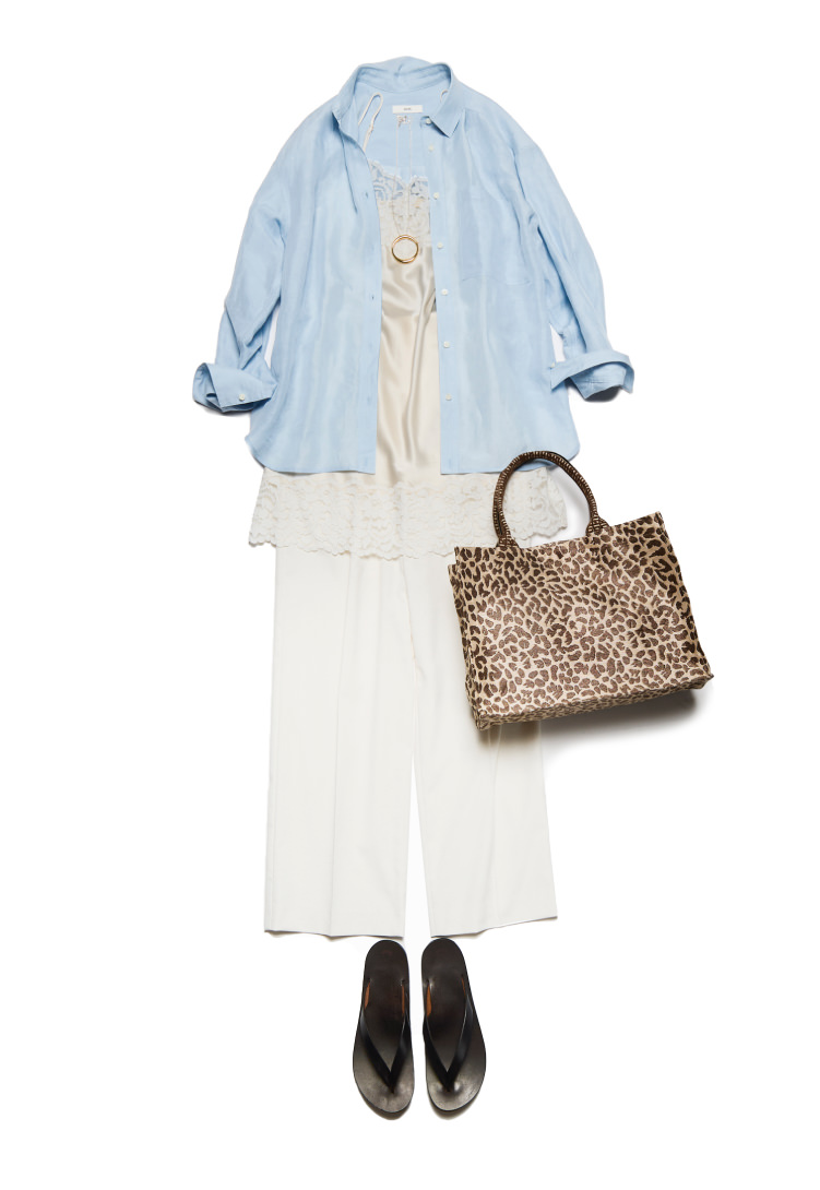 淡いサックスブルーのリネンシャツは、ナチュラルにもメンズライクにも振れるシンプルな一枚。そこにレースなどレディな要素を重ねると、新しい表情が生まれます。淡いトーンで全体をまとめつつ、柄やカジュアルな要素をさりげなく加え、表情のある着こなしに仕上げました。足元はトングサンダルで外し、軽やかさをプラスして。