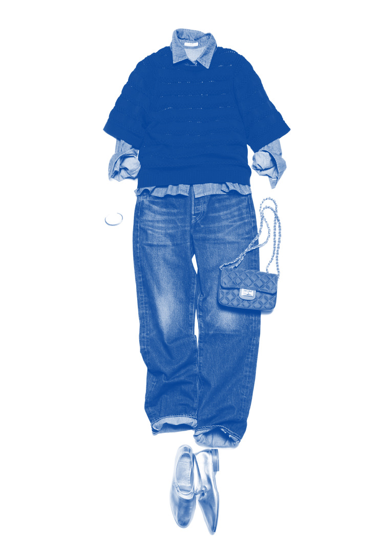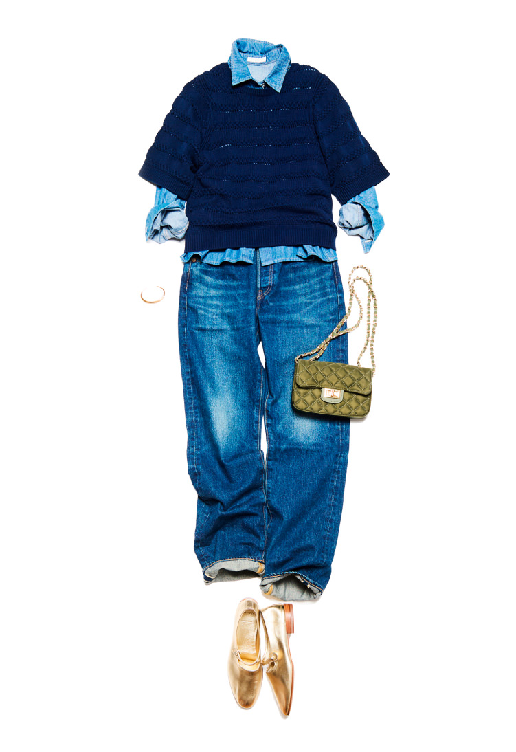 色のトーンを揃えると、カジュアルなアイテムも自然と品よくまとまります。半袖ニットに長袖シャツを重ねて奥行きを生み、単調にならないワントーンコーデに。インディゴからネイビーへとつながるグラデーションで、全体に落ち着きと統一感を引き出しました。ゴールドの小物で控えめな華やぎを添え、カーキのバッグで全体にやわらかな深みを加えています。