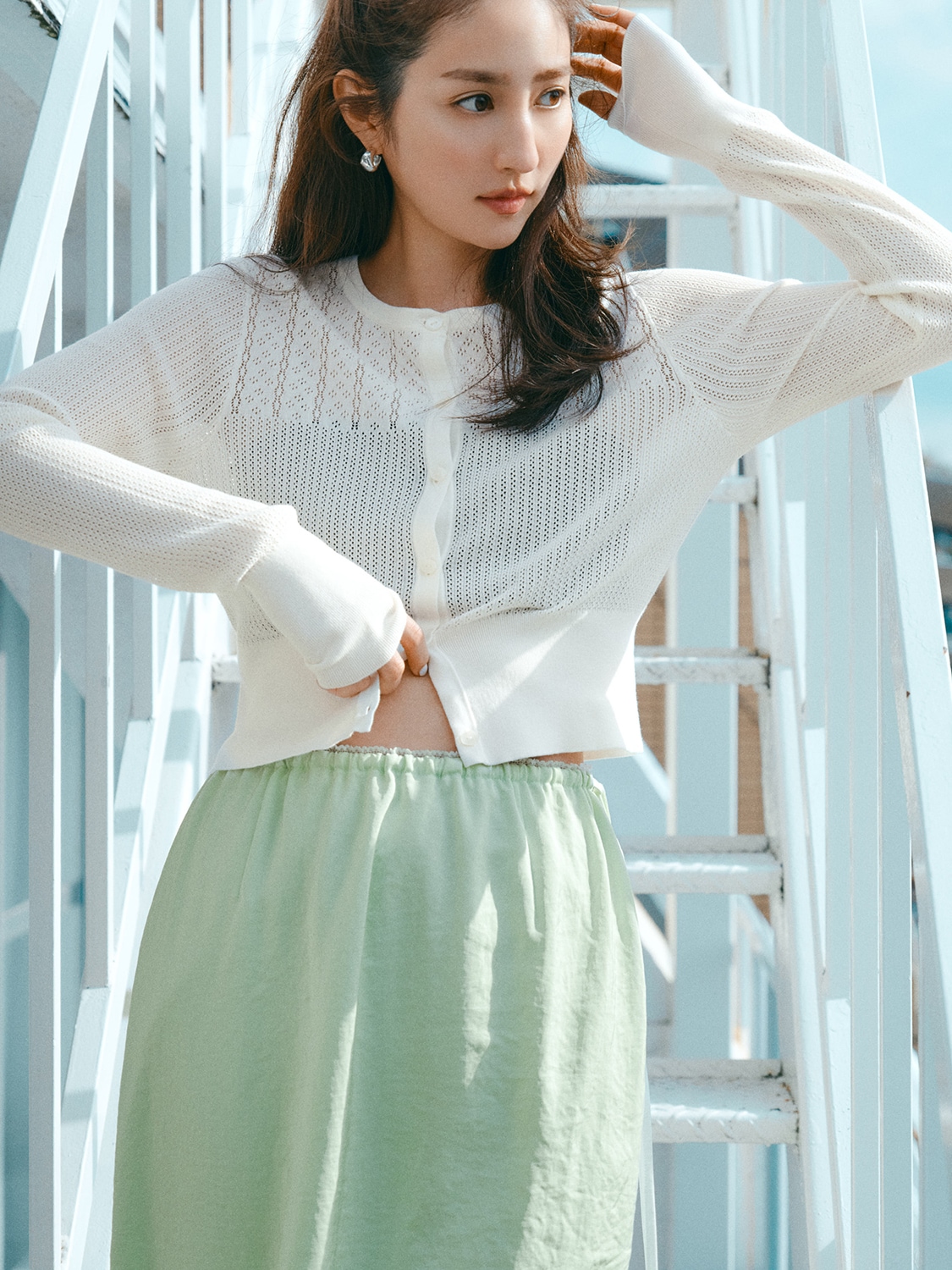 Day1の色違い。あたたかくなってきたらトップスとして1枚で着るのもおすすめ。レースのような編みのデザインから透ける素肌がヘルシーにうつると思います。ディテールまで愛せるように、楕円形のボタンにしたのもお気に入り。 見た目で伝わらないのが残念なほどに、ずっと着ていたくなるほどやわらかく、軽い素材。夏の汗ばむ肌でもストレスなく着られます。